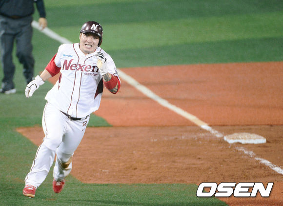 8일 오후 서울 목동구장에서 열린 '2013 한국야쿠르트 세븐 프로야구' 준플레이오프 1차전 넥센 히어로즈(3위)와 두산 베어즈(4위)의 경기, 6회말 2사 2루 이성열의 적시타때 2루주자 박병호 홈까지 달리며 득점을 올리고 있다.