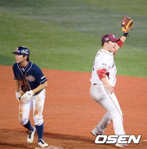 8일 오후 서울 목동구장에서 열린 '2013 한국야쿠르트 세븐 프로야구' 준플레이오프 1차전 넥센 히어로즈(3위)와 두산 베어즈(4위)의 경기, 7회초 1사 1루 오재일 넥센 이택근 중견수 플라이 아웃때 1루 주자 정수빈 1루로 귀루하였으나 포스아웃 되고 있다.