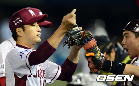 8일 오후 서울 목동구장에서 열린 '2013 한국야쿠르트 세븐 프로야구' 준플레이오프 1차전 넥센 히어로즈(3위)와 두산 베어즈(4위)의 경기, 7회초 1사 1루 대타 오재일의 중견수 플라이 아웃 상황, 중견수 이택근이 1루로 송구, 1루로 돌아오지 못한 1주자 정수빈까지 아웃 시킨후 이택근이 동료들의 환호를 받으며 덕아웃으로 향하고 있다.