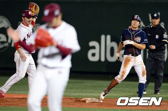 8일 오후 서울 목동구장에서 열린 '2013 한국야쿠르트 세븐 프로야구' 준플레이오프 1차전 넥센 히어로즈(3위)와 두산 베어즈(4위)의 경기, 7회초 1사 1루 대타 오재일의 중견수 플라이 아웃 상황, 중견수 이택근이 1루로 송구, 1루로 돌아오지 못한 1주자 정수빈까지 아웃. 정수빈이 아쉬워하고 있다.