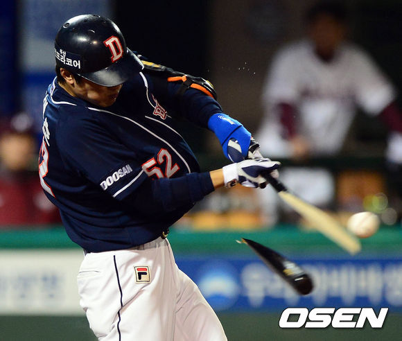 8일 오후 서울 목동구장에서 열린 '2013 한국야쿠르트 세븐 프로야구' 포스트시즌 넥센 히어로즈와 두산 베어스의 준플레이오프 1차전 경기 8회초 선두타자 김재호가 내야땅볼 타구를 치면서 배트가 부러지고 있다.