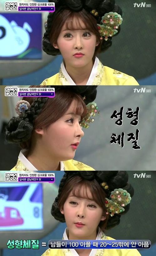 이어 그는 "남들이 100 아플 때 저는 20 정도 아프다. 성형한 날 맛집도 가고 다음날 클럽도 간다"면서 "부기도 되게 빨리 빠진다. 멍도 잘 안든다. 완벽한 성형 체질이다"고 밝혔다.