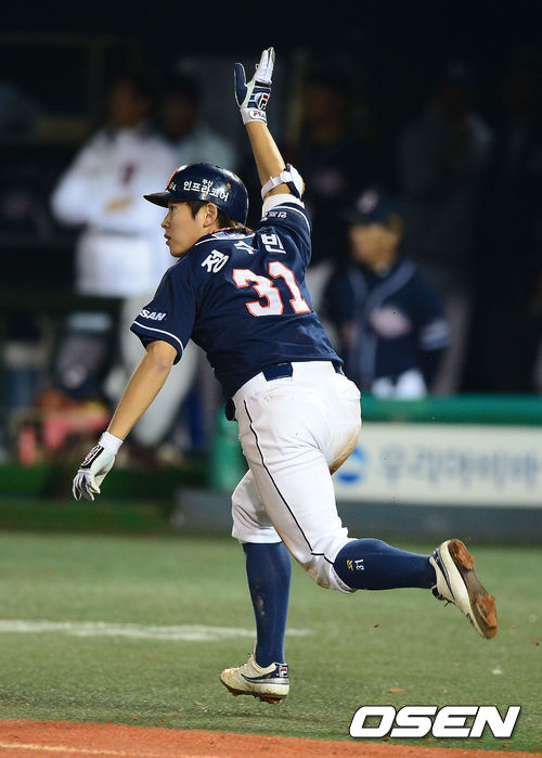 8일 오후 서울 목동구장에서 열린 '2013 한국야쿠르트 세븐 프로야구' 준플레이오프 1차전 넥센 히어로즈(3위)와 두산 베어즈(4위)의 경기, 9회초 2사 1루 두산 정수빈이 동점 적시타를 때린 뒤 기뻐하고 있다.