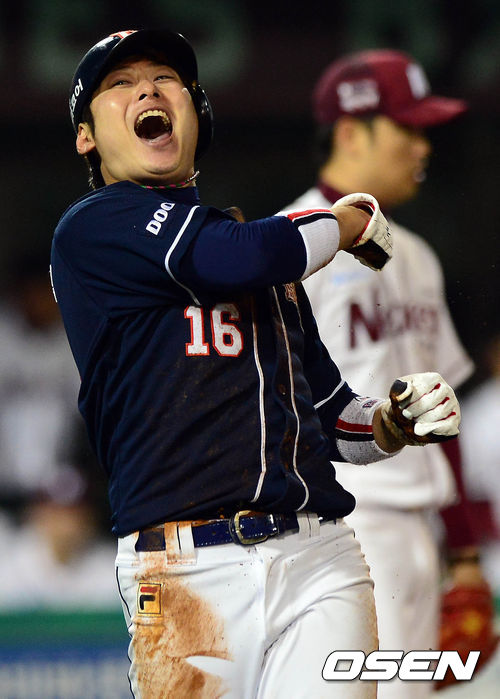 8일 오후 서울 목동구장에서 열린 '2013 한국야쿠르트 세븐 프로야구' 포스트시즌 넥센 히어로즈와 두산 베어스의 준플레이오프 1차전 경기 9회초 2사 1루 정수빈의 1타점 2루타에 득점한 1루주자 이원석이 환호하고 있다.