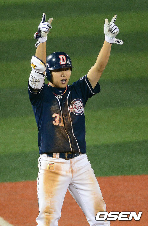 8일 오후 서울 목동구장에서 열린 '2013 한국야쿠르트 세븐 프로야구' 준플레이오프 1차전 넥센 히어로즈(3위)와 두산 베어즈(4위)의 경기, 9회초 2사 1루 정수빈 중견수 키를 넘기는 동점 적시타를 날리고 3루에서 환호하고 있다.
