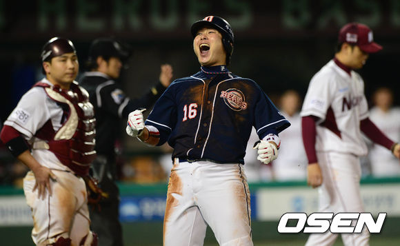 8일 오후 서울 목동구장에서 열린 '2013 한국야쿠르트 세븐 프로야구' 포스트시즌 넥센 히어로즈와 두산 베어스의 준플레이오프 1차전 경기 9회초 2사 1루 정수빈의 1타점 2루타에 득점한 1루주자 이원석이 환호하고 있다.