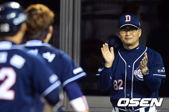 8일 오후 서울 목동구장에서 열린 '2013 한국야쿠르트 세븐 프로야구' 준플레이오프 1차전 넥센 히어로즈(3위)와 두산 베어즈(4위)의 경기, 9회초 2사 1루 두산 김진욱 감독이 정수빈의 안타때 득점을 올린 이원석을 보며 미소를 짓고 있다.