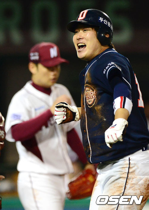8일 오후 서울 목동구장에서 열린 '2013 한국야쿠르트 세븐 프로야구' 포스트시즌 넥센 히어로즈와 두산 베어스의 준플레이오프 1차전 경기 9회초 2사 1루 정수빈의 1타점 2루타에 득점한 1루주자 이원석이 환호하고 있다.