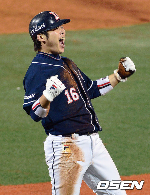 8일 오후 서울 목동구장에서 열린 '2013 한국야쿠르트 세븐 프로야구' 준플레이오프 1차전 넥센 히어로즈(3위)와 두산 베어즈(4위)의 경기, 9회초 2사 1루 정수빈의 적시타때 1루 주자 이원석 동점 득점을 올리며 환호하고 있다.