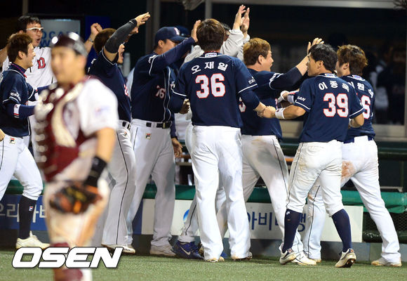 8일 오후 서울 목동구장에서 열린 '2013 한국야쿠르트 세븐 프로야구' 준플레이오프 1차전 넥센 히어로즈(3위)와 두산 베어즈(4위)의 경기, 9회초 2사 1루 두산 정수빈이 적시타로 득점을 올린 이원석이 동료들에게 축하받고 있다.