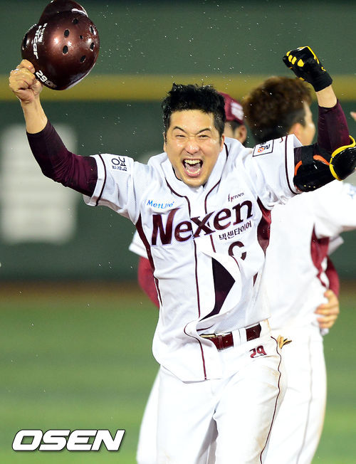 8일 오후 서울 목동구장에서 열린 '2013 한국야쿠르트 세븐 프로야구' 포스트시즌 넥센 히어로즈와 두산 베어스의 준플레이오프 1차전 경기 9회말 2사 2,3루 이택근이 끝내기 안타를 치고 환호하고 있다.