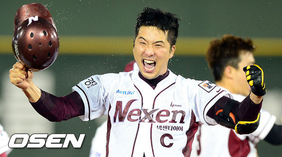 8일 오후 서울 목동구장에서 열린 '2013 한국야쿠르트 세븐 프로야구' 포스트시즌 넥센 히어로즈와 두산 베어스의 준플레이오프 1차전 경기 9회말 2사 2,3루 이택근이 끝내기 안타를 치고 환호하고 있다.