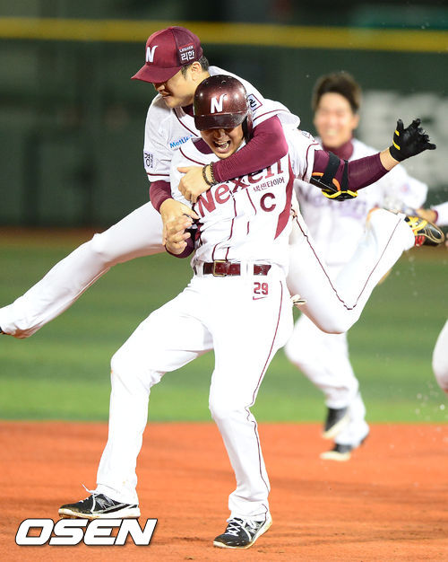 8일 오후 서울 목동구장에서 열린 '2013 한국야쿠르트 세븐 프로야구' 포스트시즌 넥센 히어로즈와 두산 베어스의 준플레이오프 1차전 경기 9회말 2사 2,3루 이택근이 끝내기 안타를 치고 환호하며 손승락과 기뻐하고 있다.