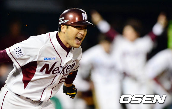 8일 오후 서울 목동구장에서 열린 '2013 한국야쿠르트 세븐 프로야구' 포스트시즌 넥센 히어로즈와 두산 베어스의 준플레이오프 1차전 경기 9회말 2사 2,3루 이택근이 끝내기 안타를 치고 환호하고 있다.