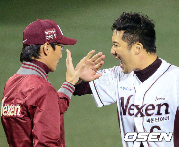 9회말 2사 2,3루 이택근 끝내기 안타를 날리고 경기 종료후 염경엽 감독의 환영을 받고 있다./ ajyoung@osen.co.kr