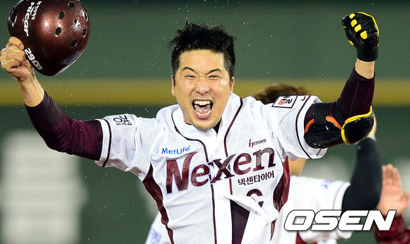 8일 오후 서울 목동구장에서 열린 '2013 한국야쿠르트 세븐 프로야구' 포스트시즌 넥센 히어로즈와 두산 베어스의 준플레이오프 1차전 경기 9회말 2사 2,3루 끝내기 안타를 때린 이택근이 환호하고 있다.