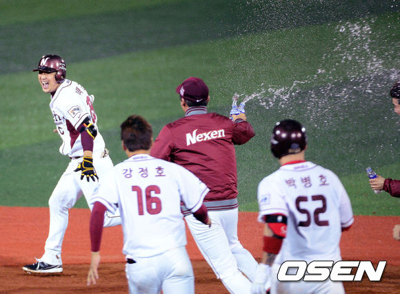 8일 오후 서울 목동구장에서 열린 '2013 한국야쿠르트 세븐 프로야구' 포스트시즌 넥센 히어로즈와 두산 베어스의 준플레이오프 1차전 경기 9회말 2사 2,3루 이택근이 끝내기 안타를 치고 환호하고 있다.