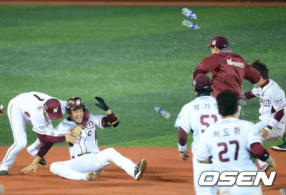 8일 오후 서울 목동구장에서 열린 '2013 한국야쿠르트 세븐 프로야구' 포스트시즌 넥센 히어로즈와 두산 베어스의 준플레이오프 1차전 경기 9회말 2사 2,3루 이택근이 끝내기 안타를 치고 동료들의 환영을 받고 있다.