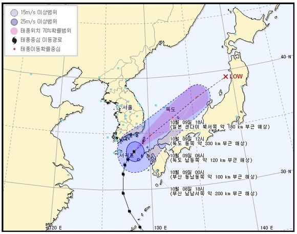 [OSEN=이슈팀] 제 24호 태풍 다나스(DANAS)가 대한해협을 통과하고 있는 가운데 기상청은 8일 밤 11시를 기해 경상남도(통영시, 거제시), 부산광역시, 동해남부 먼바다, 남해동부 전해상에 태풍 경보를 발효한다.