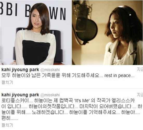 이 같은 사실은 가희가 자신의 트위터를 통해 공개하며 알려졌다. 가희는 9일 오전 자신의 트위터에 “로티플스카이 하늘이는 제 컴백곡 'It's Me'의 작곡가 엘리스스카이입니다”라며 “하늘이의 첫 작품입니다. 마지막이 되어버렸습니다. 하늘이를 위해 노래하겠습니다. 하늘이를 기억해주세요. 하늘아... 편히...”라며 절친한 동생의 죽음을 애도했다.