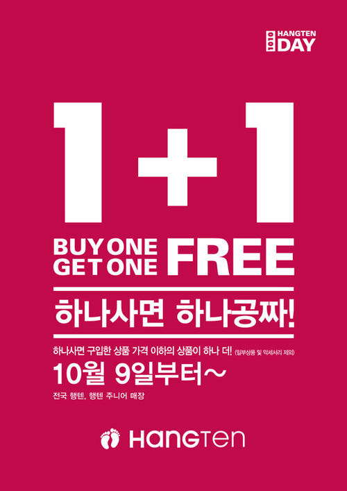 [OSEN=이슈팀]아메리카 모던 캐주얼 ‘행텐’(HANG TEN, www.hangten.co.kr)에서는 10월 9일 전국 행텐&행텐주니어 매장에서 동시에 ‘행텐데이 1+1이벤트’를 진행한다.