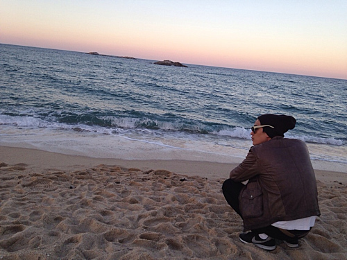 사진 속에서 강경준은 가죽재킷에 블랙진을 입고 비니와 선글라스를 착용, 센스 있는 패션을 선보이고 있다. 모래사장에 앉아 바다를 바라보고 있는 모습이 화보를 연상케 해 한다.