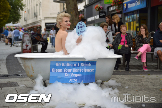 [OSEN/WENN 특약] 동물 보호 운동에는 왜 참가자들 누드가 단골일까? '동물을 인도적으로 사랑하는 사람들'(PETA)의 한 금발미녀 회원이 영국 웨일즈 카디프시 도심 한복판에 욕조를 놓은채 거품 목욕을 즐기는 퍼포먼스로 동물 및 환경보호 시위를 펼치고 있다. 도심에서 알몸 목욕중인 PETA 회원이 손에 든 피켓과 욕조에 붙인 슬로건은 '50번의 목욕이 스테이크 한 조각'으로 육식이 가져오는 환경 오염과 피해를 강조한다.