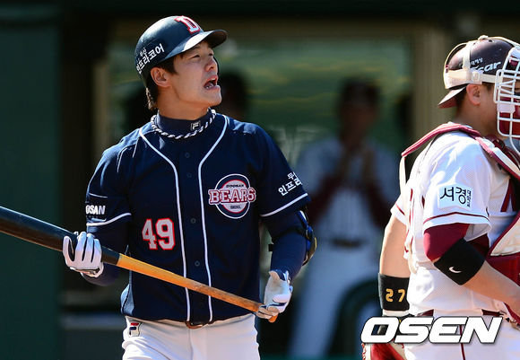 9일 오후 서울 목동구장에서 열린 '2013 한국야쿠르트 세븐 프로야구' 준플레이오프 2차전 넥센 히어로즈와 두산 베어스의 경기 1회초 1사 2루 민병헌이 헛스윙 삼진을 당한 후 아쉬워하고 있다.