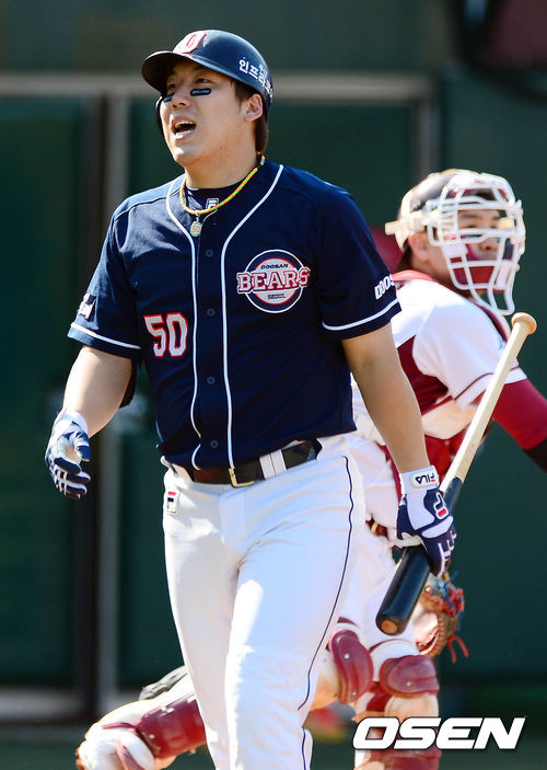 9일 오후 서울 목동구장에서 열린 '2013 한국야쿠르트 세븐 프로야구' 준플레이오프 2차전 넥센 히어로즈와 두산 베어스의 경기 1회초 2사 2루 김현수가 헛스윙 삼진을 당한 후 아쉬운 표정을 짓고 있다.