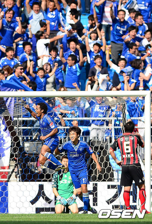 9일 오후 수원 월드컵경기장에서 '2013 현대오일뱅크 K리그 클래식' 수원 삼성과 FC 서울의 경기 후반 선취골을 넣은 수원 산토스가 기뻐하고 있다.