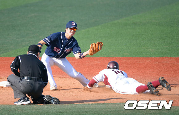 9일 오후 서울 목동구장에서 열린 '2013 한국야쿠르트 세븐 프로야구' 준플레이오프 2차전 넥센 히어로즈 와 두산 베어스의 경기, 5회말 1사 1루 서동욱 타석때 1루 주자 서건창 2루 도루를 하였으나 태그아웃 처리되고 있다.