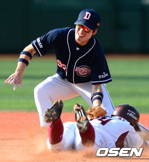 9일 오후 서울 목동구장에서 열린 '2013 한국야쿠르트 세븐 프로야구' 준플레이오프 2차전 넥센 히어로즈와 두산 베어스의 경기 5회말 1사 1루 서동욱 타석, 1루주자 서건창이 도루에 실패하고 있다.