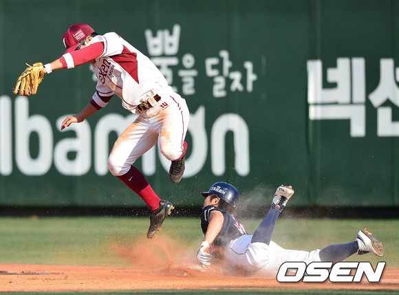 9일 오후 서울 목동구장에서 열린 '2013 한국야쿠르트 세븐 프로야구' 준플레이오프 2차전 넥센 히어로즈 와 두산 베어스의 경기, 7회초 두산 공격 선두타자로 나선 정수빈이 기습 번트안타를 날리고 1루에 슬라이딩해 세이프 되고 있다. 이후 악송구를 틈타 2루까지 내달렸지만 아웃.