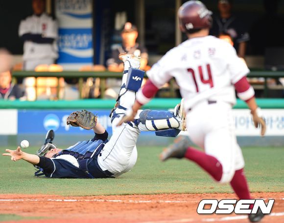 9일 오후 서울 목동구장에서 열린 '2013 한국야쿠르트 세븐 프로야구' 준플레이오프 2차전 넥센 히어로즈 와 두산 베어스의 경기, 8회말 넥센 공격 2사 3루 상황, 4번 박병호 타석 때 두산 투수 홍상삼의 폭투로 3루 주자 서건창이 홈으로 내달리고 있다. 흘러나간 공을 잡아 홈으로 송구를 시도하는 두산 포수 양의지.