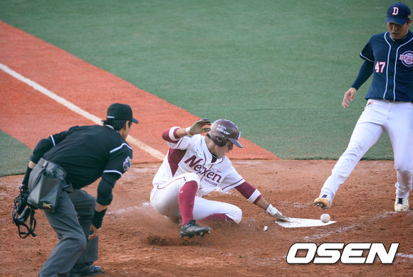 9일 오후 서울 목동구장에서 열린 '2013 한국야쿠르트 세븐 프로야구' 준플레이오프 2차전 넥센 히어로즈 와 두산 베어스의 경기, 8회말 2사 3루 두산 홍상삼의 와일드피칭때 3루 주자 서건창 동점 득점을 올리고 있다.