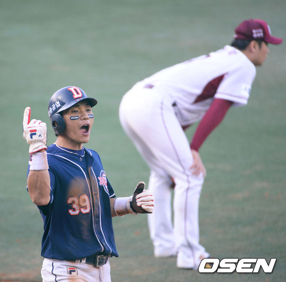 9일 오후 서울 목동구장에서 열린 '2013 한국야쿠르트 세븐 프로야구' 준플레이오프 2차전 넥센 히어로즈 와 두산 베어스의 경기, 9회초 무사 2루 정수빈의 보내기 번트때 2루주자 이종욱 득점을 올리며 환호하고 있다.