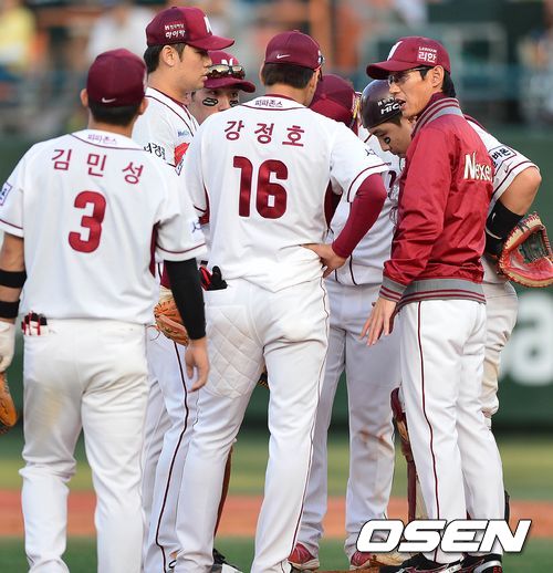 이 상황을 직후 넥센 염경엽 감독이 마운드에 올라 야수들과 대화를 나누고 있다.