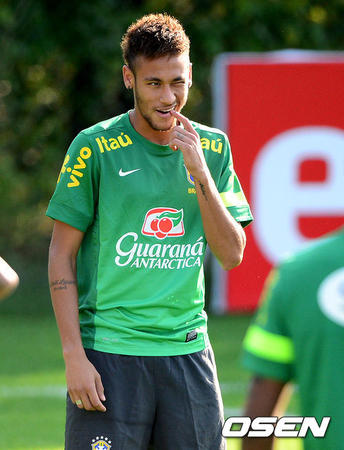 네이마르가 몸을 풀며 익살스런 표정을 짓고 있다.
