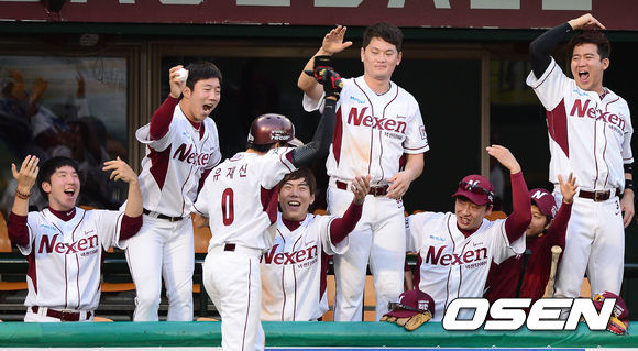 9일 오후 서울 목동구장에서 열린 '2013 한국야쿠르트 세븐 프로야구' 준플레이오프 2차전 넥센 히어로즈와 두산 베어스의 경기 9회말 1사 만루 서건창 타석, 밀어내기로 득점한 3루주자 유재신이 덕아웃에서 동료들과 하이파이브를 하고 있다.