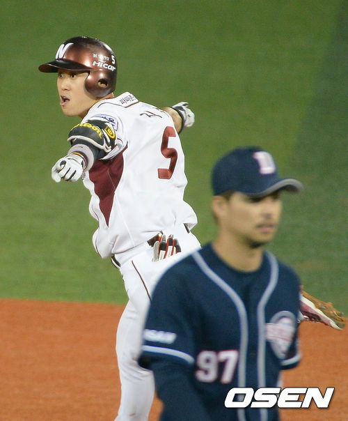 9일 오후 서울 목동구장에서 열린 '2013 한국야쿠르트 세븐 프로야구' 준플레이오프 2차전 넥센 히어로즈 와 두산 베어스의 경기,연장 10회말 1사 3루 김지수가 끝내기 안타를 치고 환호하고 있다./ ajyoung@osen.co.kr