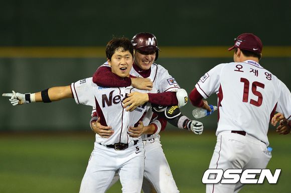 연장 10회말 1사 3루 상황 6번 김지수가 끝내기 우전안타를 날리고 동료들의 축하 세례를 받고 있다./ dreamer@osen.co.kr