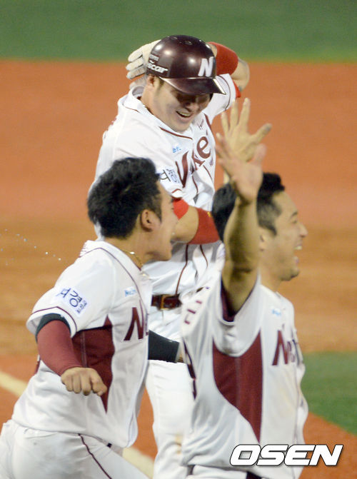 9일 오후 서울 목동구장에서 열린 '2013 한국야쿠르트 세븐 프로야구' 준플레이오프 2차전 넥센 히어로즈 와 두산 베어스의 경기,연장 10회말 1사 3루 김지수가 끝내기 안타때 3루주자 박병호가 득점을 올리며 환호하고 있다./ ajyoung@osen.co.kr