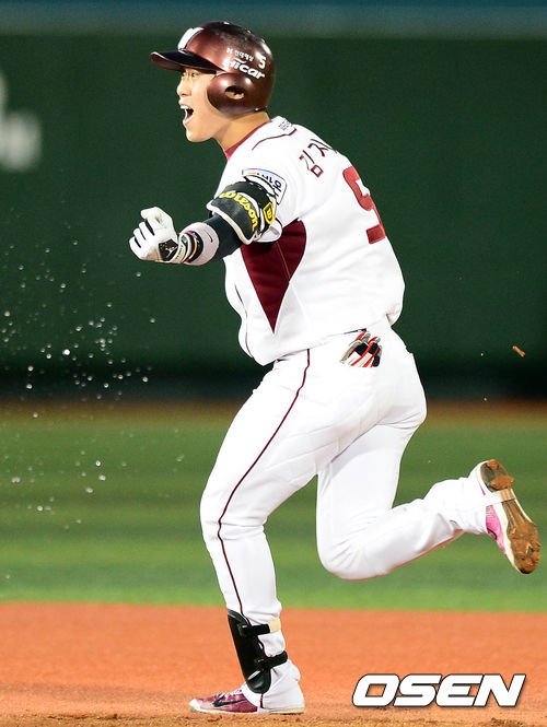 9일 오후 서울 목동구장에서 열린 '2013 한국야쿠르트 세븐 프로야구' 준플레이오프 2차전 넥센 히어로즈와 두산 베어즈의 경기 10회말 1사 3루 김지수가 끝내기 안타를 치고 환호하고 있다.