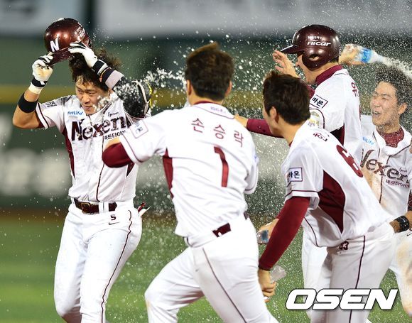 연장 10회말 1사 3루 상황 6번 김지수가 끝내기 우전안타를 날리고 동료들의 물세례를 받으며 환호하고 있다./ dreamer@osen.co.kr