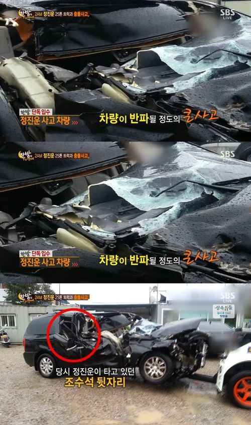 그룹 2AM 정진운이 교통사고를 당한 가운데 반파된 사고차량의 모습이 '한밤'을 통해 공개됐다.