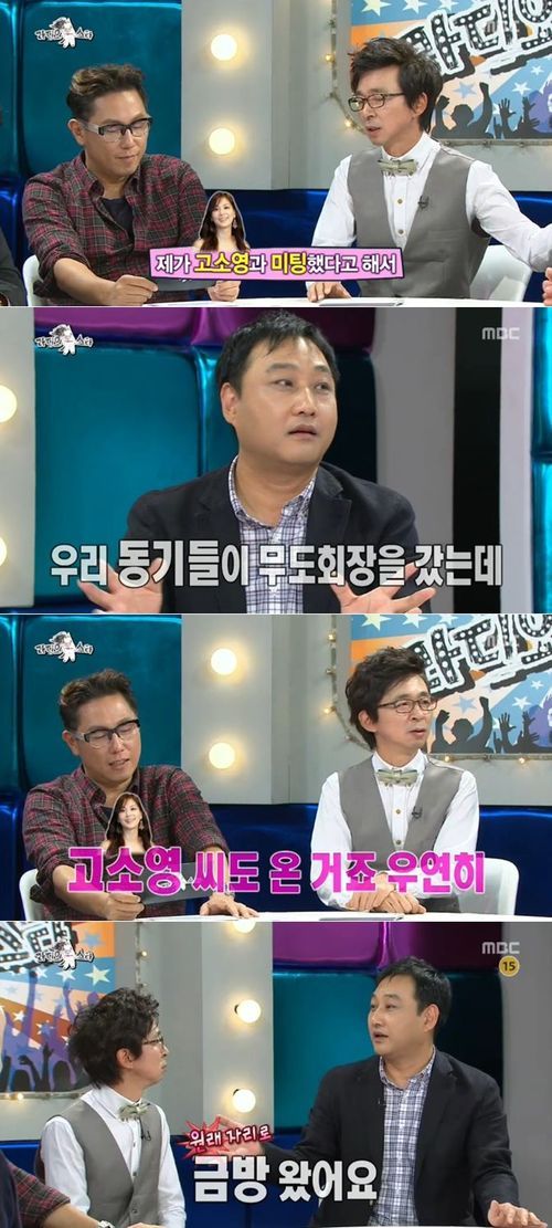 이날 김국진의 추천으로 게스트 출연한 김수용은 김국진-고소영 미팅설에 대해 "사실은 나이트 클럽에서 우연하게 만났다"고 진실을 폭로했다.
