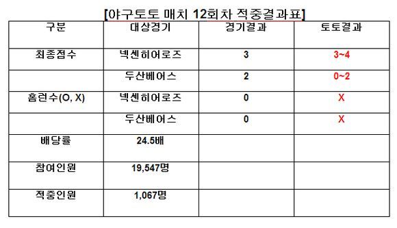야구토토 매치 12회차 최종 적중결과는 넥센 홈런 ‘X’, 최종점수대 ‘3~4’, 두산 홈런 ‘X’, 최종점수대 ‘0~2’로 나타났다. 적중자 가운데 최대 베팅금액인 10만 원을 베팅한 3명의 야구팬은 이번 회차 최고액인 245만 원의 적중상금을 받게 됐고, 최소 베팅금액인 100원을 베팅한 148명의 적중자들에게는 각각 2450원씩 환급금이 주어진다.