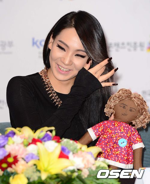 그룹 2NE1 씨엘이 아우인형의 얼굴을 그리고 미소를 짓고 있다.