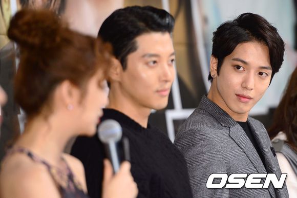 배우 정용화가 취재진의 질문에 답하는 윤은혜를 바라보고 있다.
