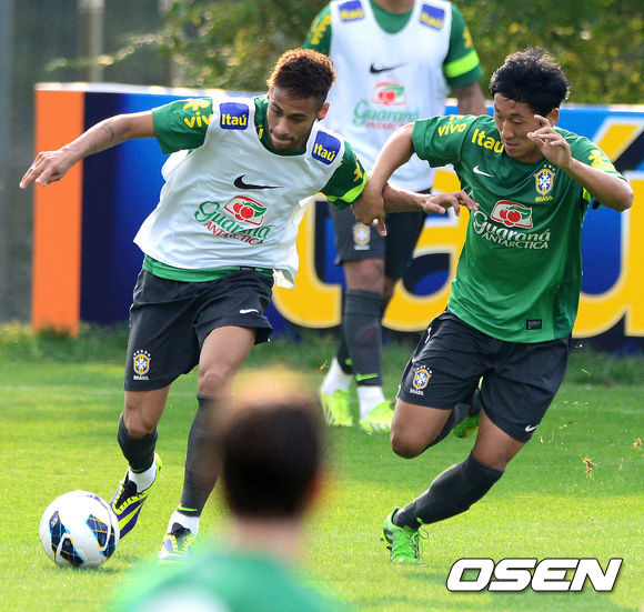 훈련파트너로 발탁된 U-20 남자 월드컵 국가대표 김용환이 네이마르를 수비하고 있다.